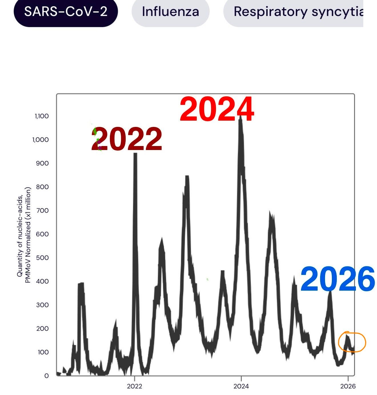 Fourth, my choices will change as new data is found/reported/generated. This is the nature of science and science based decision making, changes do occur. For example, we have now had a long period of SARS-CoV-2 virus mutations that has failed to fully evade vaccine protection in a way that lead to disease spikes like those seen in 2022 or 2024. In fact, this winter (2025-26) showed waste water levels lower than that of the summer, using the same methodologies and tracking stations across the United States (see below, circled in orange: source data WASTEWATERSCAN.ORG). But if a new variant that I am concerned about is identified, I will resume more careful habits and of course, let everyone know.